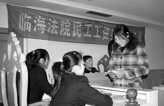 昨天上午9时许,临海市杜桥镇的29名被拖欠工资的民工从临海法院全额领回了被拖欠的工资。