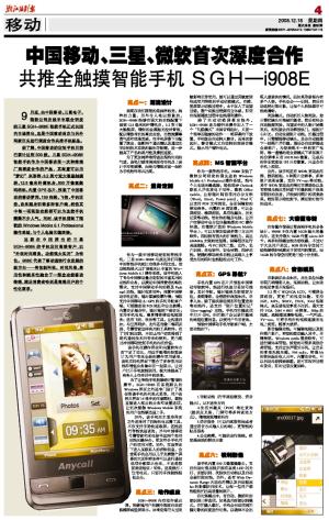 9月底,由中国移动、三星电子、微软公司历经半年联合研发的三星SGH-i908E智能手机正式向国内市场推出,这是中国移动首次与另外两家巨头进行深度合作共推手机新品。