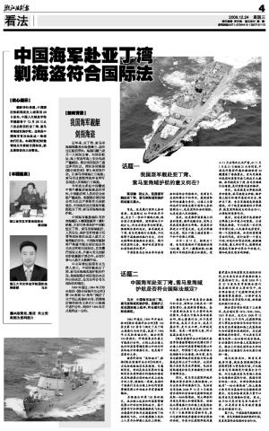 据新华社报道,中国国防部新闻发言人胡昌明20日宣布,中国人民解放军海军舰艇将于12月26日从三亚启航前往亚丁湾、索马里海域实施护航。这将是中国海军首次远赴这一海域执行任务。本期《看法》特邀请相关专家结合国际法,就此事谈谈自己的看法。