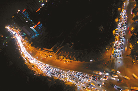 12月6日晚6时20分许,温州市区百里东路华盖广场前的十字路口红绿灯因停电无法启用,车辆排起了长龙。