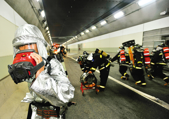 当日,武汉市在即将试通车的长江隧道举行大型消防演习。演习模拟“车辆自燃”和“连环相撞”事故,调度消防、公安、120等多部门联合参与,并启用了隧道内的高端消防设施。武汉长江隧道将于12月28日试通车。