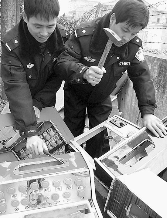 12月28日中午,台州市路桥公安分局金清派出所对最近缴获的53台老虎机进行了集中销毁。