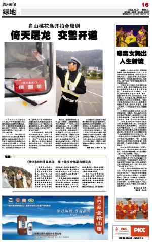 12月18日,《倚天屠龙记》剧组结束武当山的拍摄,转场到桃花岛。该剧组演职人员共有三百多人,单是装运拍摄器材的大卡车就有四十多辆,加上运送演员的大客车及部分演员的私家车,此次进岛的车辆达五十多辆。这给本身只有100辆汽车保有量的桃花岛的道路交通带来了很大的压力。为了确保岛上交通环境的安全、便利,桃花交警中队充分准备,为剧组打造了一条“绿色通道”。