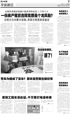 5日早上7时19分,赤庙中队接到“110”指令:一辆桑塔纳轿车在河头镇百步大桥附近被一辆货车上掉下来的货物击中,造成车辆损坏,肇事车辆正往临海方向行驶,要求立即出警拦截。接警后,赤庙中队将警力分成两组:一组前往事故地点勘查现场,一组则在留贤收费站设卡拦截。