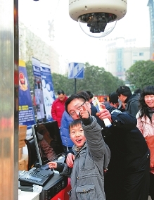1月9日,湖州警方举办了一场以“安全技术防范”为主题的广场警务活动。图为一个小男孩在民警的帮助下,发现了监控探头的“神奇”之处。