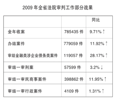 金融危机肆虐全球的2009年是不平凡的一年,在抗击这场危机中,浙江法院发挥自身职能,为我省经济社会平稳较快发展提供了有力的司法保障。这一年来,全省法院全年新收各类案件785435件,办结779059件,同比分别上升9.71%、11.92%。