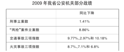 去年,我省各地公安部门开展了打击整治“两抢”犯罪大会战;打黑除恶、打击假币、假发票等各类专项行动。全年共破各类刑事案件21.27万起,抓获逃犯2.98万名。去年全省刑事立案数和其中的“两抢”案件立案数同比分别下降1.41%和8.86%。交通事故三项指数同比分别下降9.77%、2.97%和10.18%,火灾事故三项指数同比分别下降8.7%、7.1%和6.8%。