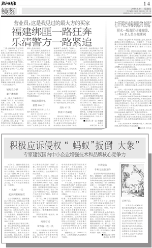 这虽然是一起蚂蚁扳倒大象的典型案例,也体现了中国民族企业知识产权意识的觉醒,但仍然无法掩盖国内中小企业缺乏核心竞争力的窘迫现状。专家建议,国内企业不但要在应对知识产权纠纷时敢于应诉,坚决维护自己的合法权益,还要在核心技术的研发和品牌建设中增强自己的核心竞争力,以应对日益复杂的全球化经济浪潮。