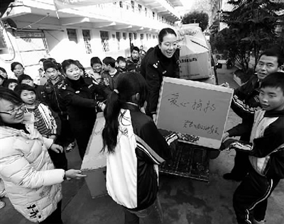 1月12日,台州市公安局黄岩分局在爱民大走访中开展向民工子女献爱心活动。图为该局女民警把棉被、棉衣等生活用品送到三友民工子弟学校。■通讯员喻跃翔摄
