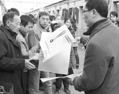 1月12日下午,玉环县副县长陈安(右)来到大麦屿新民小区,给新玉环人送上“消防年货”。新民小区居住着外来民工600多人,副县长陈安和县消防大队官兵们一起给民工们送去消防安全书籍及宣传年画等。■通讯员江勇兵徐慧棋黄莹摄