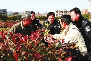 图为1月14日下午,该局民警与收购苗木的公司负责人在田头了解村里低收入农户老符的苗木种植情况。在该局帮助下,老符去年4月种植的3万株苗木,如今可以为他带来18000元纯收入。■通讯员郭庆睿