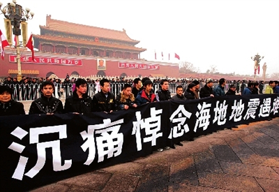 昨天,专程接运在海地地震灾害中遇难的8位中国维和警察灵柩的专机抵达北京。这是群众在长安街上手持横幅悲迎烈士灵柩的场景。