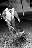他利索地从附近垃圾房里拿出扫帚、畚箕,将街边的垃圾往街中间扫拢。碰上粘在地上的垃圾,他还得用扫帚用力来回多扫几下。