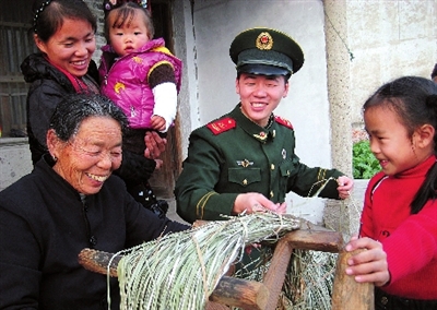 从元月1日至3月底,浙江公安边防总队台州边防支队集中组织干警深入村居,开展为期3个月的“今冬明春大走访”爱民实践活动。图为昨天,台州边防支队金清边防派出所干警与驻地联盟村王阿婆一起编纺草绳。 ■通讯员李进雄摄