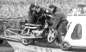 前日,桐乡市公安局水上派出所的民警经过近一个小时的努力,成功将因桥梁突然垮塌而滑落水中的摩托车打捞上岸。看见自己落水的“马儿”上岸,车主陆某感激万分。■通讯员阮慧燕摄