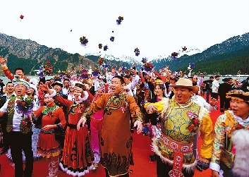 5月2日,来自全国各地56个民族的112位新人在天山天池湖畔将手中的鲜花高高抛起。