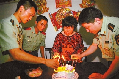 5月7日,广东边防七支队勤务中队官兵带着慰问品,前往抗洪英雄李大为的母亲家中为她庆祝生日,喜过母亲节。 ■新华社陈培高摄