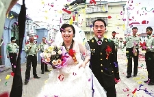 就在胡列生为婚礼改期而纠结时,同样为他的婚礼在考虑的还有那些已经收到婚礼请柬的驻地领导。“世博安保是大事,但是婚姻也是个人的大事,我们有义务帮助他们举行一场有意义的婚礼。”于是在部队领导提议下,5月8日,一场简单而又隆重的婚礼在全塘卡点住宿基地正式上演。