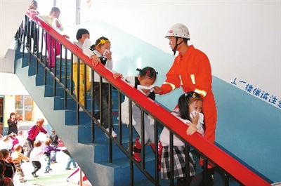 5月7日,台州市公安局黄岩分局民警在新砚池幼儿园教小朋友如何在火场中逃生。