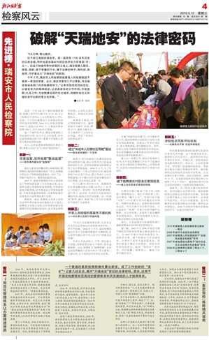 一个普通的基层检察院缘何屡出新招,成了工作创新的“富矿”?记者几经采访,揭开“天瑞地安”背后的法律密码。原来,这离不开瑞安检察院规范高效的管理体系和灵活激励的人才培养体系。