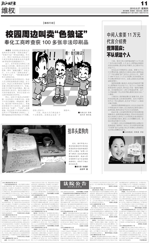近日,有学生家长向奉化工商局执法人员反映,称奉化市丘林中心小学等学校附近,有小店向学生兜售一种叫“恶搞乐翻天”的纸卡片,卡片上印有“顶级色狼证”、“发春许可证”、“国际最佳流氓”等不文明的内容。