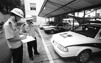 8月1日,台州市公安局黄岩分局警务督察大队民警正在对局机关车库的警车停放情况进行督察,对于没有停在车库的警车,逐一查明去向,以切实加强对警用车辆的管理,提高警车使用的规范化、制度化。