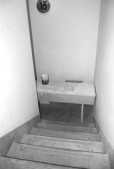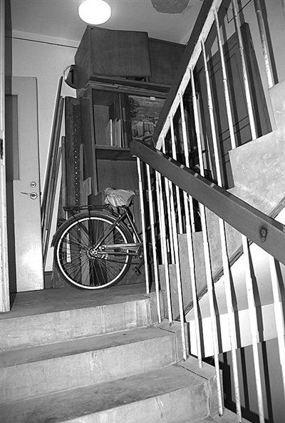 没想到,13楼的通道大门也是大开,转角也被打造成了一个储物间:一辆黄色的女士自行车和一辆蓝色男士自行车并排靠在一起,旁边放着一张积满灰尘的床垫和3个空油漆桶,占据了2/3的通道。我放慢了脚步,小心地侧身通过,以免踢翻油漆桶。