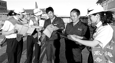 8月20日下午,舟山普陀山客运码头,普陀山海事处“海浪花”女子服务队正在向到港船舶的船员发放有关船员考试、发证及暑期水上客运安全知识等便民卡片。