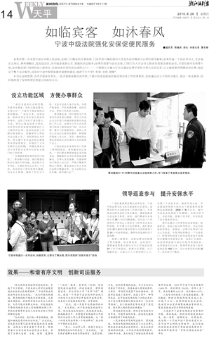 三是提升了法官文明执法的素质和形象。蒋剑巍说,新的安保制度实施以来,统一着装,挂牌进出,文明接待,成为每一个宁波中院干警的自觉行为。在宁波市文明机关考核中,我们实施的安保制度受到了考核组的高度评价,连续两年被评为“市级文明机关标兵”单位。