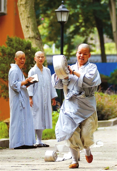 昨天中午,这支女子消防队正在训练。甩水带、接水枪一气呵成,悟海法师说,:“你别小看我们哦,在前几天的杭州佛教界首届消防运动会上,我们的圆憬法师还拿到了60米负重跑的第一名。”