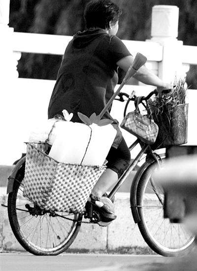 昨天上午,在温岭人民路上,一市民在自行车后座的挂篮里放置了大冰块,以对抗酷热。