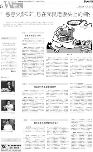 李本浪 我认为如果将恶意欠薪入罪,不但会使办企业的人战战兢兢、如履薄冰,更将直接导致劳资关系的重大变化。劳动者的权益保障可以通过扩大工会组织权力、加强劳动监察等途径解决,如果过于强调刑法打击,则可能引起的劳资关系紧张,最终引起社会关系的深层调整和震荡。