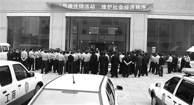 经过周密筹划和部署,当天下午2点半,椒江工商分局会同椒江葭芷派出所联合出动5辆执法车、20多名执法人员,端掉了这个传销窝点,当场查获传销人员22人。