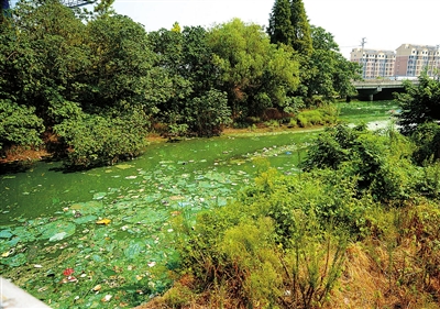 记者昨天在杭州市钱江三桥南岸的风情大道与文明路交接处看到,附近一条不知名的河上漂浮着腐烂物及厚厚的苔藓,河水呈黄绿色,随风飘来的阵阵恶臭让人作呕。