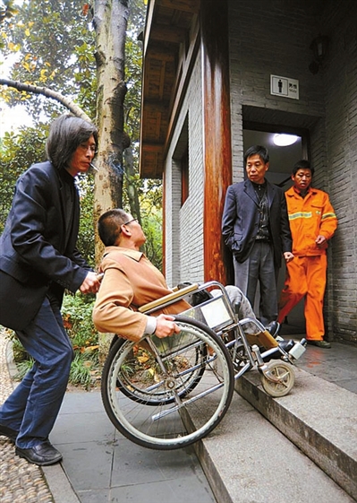 路上很顺利,张华的驾驶技术不错。到了唐云艺术馆所在的长桥公园附近,张华想上厕所。可公共厕所门口的两级台阶难倒了他。好不容易进去后,他又遇到新的难题:根本没有残疾人专用厕位!张华无奈地选择了一个儿童小便池,这是厕所里最适合残疾人的设施。
