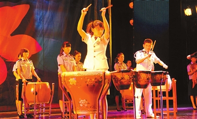 身穿中国红、腰系碎花蓝围裙的16位村嫂一上台,剧院里的观众立刻投注了期盼的目光……