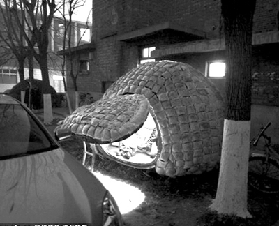 前天下午,与戴海飞同在一个大院工作的许女士称,3日晚下班时还在院里看到“蛋屋”,前天一早到单位时,就发现“蛋屋”从绿地上消失了。许女士说,这位北漂青年艰苦奋斗的精神打动了她,她很担心戴海飞未来的生活和“蛋屋”能否被保留。