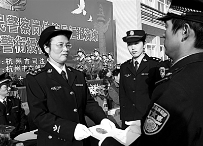 杭州市司法局党委书记、局长洪慧萍为40名民警代表颁发了警衔命令书。