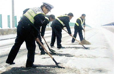湖州高速交警支队的民警上路清扫积雪,保障路面行车安全 李浙良摄