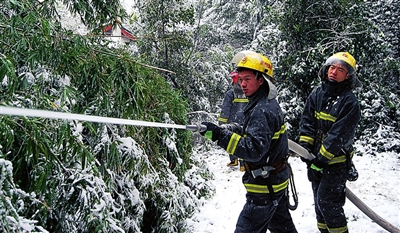 消防战士在雪天也同样严阵以待。昨天下午,战士们拿起了水枪,冲刷被积雪压弯的树枝。