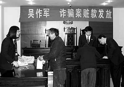 近日,嘉兴市南湖区法院以诈骗罪判处吴作军有期徒刑一年,并处罚金1万元。判决当日,法院举行了赃款发还会,37名被骗者逐一领回了被骗钱财。