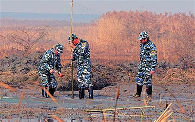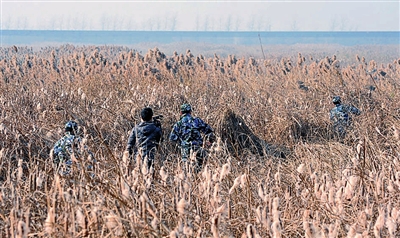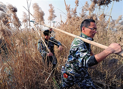 处理完一个池塘后,他们穿梭在比人还高一截的芦苇丛中,踩着冰冷的水,接着寻找下一个目标。