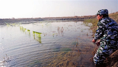 这一天,共出动了4组队员。副队长王春雷说,和过去几年相比,今年非法捕鸭的现象有所减少。他动员队员,一定要“放干水、剪掉网、拆掉棚”。