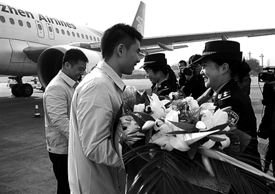12月21日,我省公安机关赴广州参加亚运安保任务的20名特警人员载誉凯旋。在3个月的执勤中,他们按照亚运安保工作程序和标准,文明执法,严格履职,圆满完成了各项工作任务。图为台州市公安局特警代表在黄岩机场迎接该局亚运安保卫士周泽伟、李俊骏。