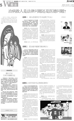 吴东波首先,从法律上看,医疗行为得以实施的前提是医患之间建立了一种契约关系,患者委托并授权医生采取某种措施治疗疾病。其次,这种契约关系一旦建立,除法律特别规定的外,医生按照普遍的行业惯例和执业标准采取的治疗措施即被法律所允许,不需要患者的再次授权,如:一般的诊疗操作、常规药物的应用等。第三,法律有特别规定的,不得违反法律的规定。本事件中,医方在患者清醒并明确反对的情形下,采纳效力较低的患者近亲属的意见强行手术,这一行为违反了《侵权责任法》第55条。虽然,该行为从治病救人的角度看是正确的,从医德的范畴考量是崇高的,但仍不能抵消其违法性。若最终该行为造成了患者的损害,医疗机构仍应当承担侵权责任。第四,法律是道德的底线,作为一个法律人,我对广州的医院甘愿冒承担侵权责任的风险也要保持医德圆满的行为表示敬意,但并不认同。更不认同李丽云事件中,部分网友对医院的横加指责。