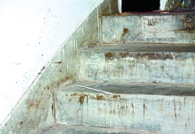 沿着楼道向上走,记者发现楼梯上有不少暗红色血迹,血迹在楼顶的601户门口消失。601户门外的墙壁底部,沾染了许多颜色更加鲜艳的血迹。门外还立着一个鞋架,上面摆满了落满灰尘的鞋子。一只白色的塑料手套被扔在门外的脚垫上,这一切迹象,确切证实了血案就发生在这里。