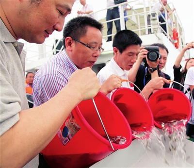 昨天,在洞头大竹峙岛附近海域,6万只黑鲷鱼苗被投放入海。“黑鲷鱼苗的存活率较高,可达90%以上。一年后,就会长到3-5公分长,那时候就可以捕捞上来卖钱了。”洞头县海洋与渔业局副局长李昌达介绍说。