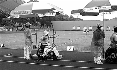 6月14日上午,大雨瓢泼。在杭州第一技师学院的射箭场,女子复合弓、反曲弓坐姿组正在冒雨比赛。作为残运会志愿者,浙江大学大二学生小陈的工作是为坐在轮椅上的选手撑伞挡雨。