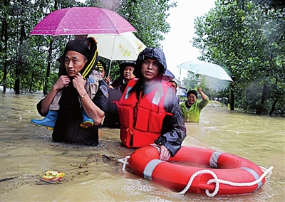 6月14日,湖北省咸宁市咸安区再次遭遇暴雨袭击,位于淦河边的咸安区龙潭中心幼儿园被洪水包围,128名幼儿和30名老师被困园内。当地公安民警和消防战士赶赴现场,拉起安全绳,肩扛怀抱幼儿们,趟水将幼儿和老师安全转移。