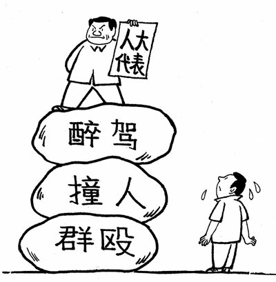 6月11日深夜,温州龙湾区一黄姓女司机醉酒驾车撞了人。在接受交警询问时,她掏出证件,放言“我是人大代表!”(6月17日《今日早报》)。在特殊场合亮明特殊身份,此招并非黄代表首创。就在前不久,中国短道速滑队队员在丽江酒后与联防队员发生冲突继而群殴,该队队员王濛就冲着调查民警吼道:“你知道我是人大代表吗?我们是世界冠军吗?”(6月8日《新快报》)。